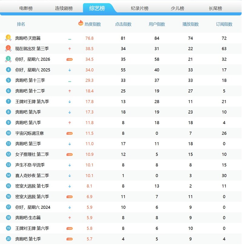 1、76.8 热度断层出圈!《奔跑吧・天路篇》国民综艺势不可挡!跑男团全员热血赴约,笑点密集不打烊,暖心瞬间频频戳心,你的全年快乐充电站已开启,快来共赏山河与欢乐的完美碰撞!